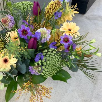 お誕生日のアレンジになります。クラシックな印象を感じさせるアレンジです。チューリップの紫をいれる事で、より一層落ち着いた印象になっております。