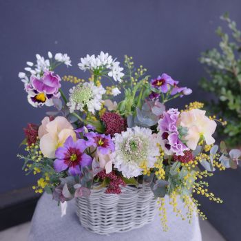 お誕生日のアレンジです。大人っぽくオシャレにとのご希望。凛としている中にもほんわかと優しい素敵な女性への贈り物でした。ワインレッドのカラーで凛としたイメージを。バラの優しい色とパンジーのフリフリした感じで優しさを表現し、全体的に大人っぽい感じに仕上げております。