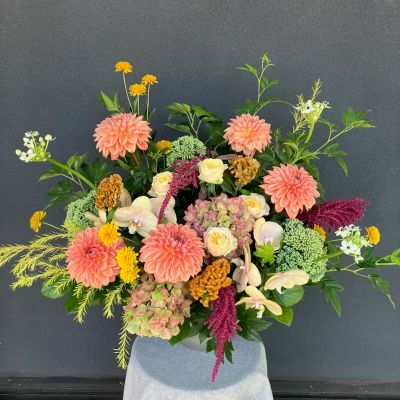 お誕生日のアレンジになります。季節のダリアや珍しいベージュのミディの胡蝶蘭を使いお作りさせていただきました。秋色アジサイもアンティークな色味をお選びし、色のトータルバランスを合わせております。差し色にワインレッドのケイトウを入れる事でより秋ぽっさを感じるアレンジに仕上げております!