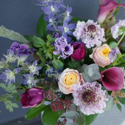 お誕生日のアレンジです。大人っぽくオシャレにとのご希望。凛としている中にもほんわかと優しい素敵な女性への贈り物でした。ワインレッドのカラーで凛としたイメージを。バラの優しい色とパンジーのフリフリした感じで優しさを表現し、全体的に大人っぽい感じに仕上げております。