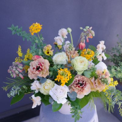 結婚記念日へ贈るアレンジでした。ランのエピデンドラムやラナンキュラスの変わり品種のシャルロット(ベージュの大輪のお花)やカランコエ、スイトピー、ミモザなど季節をたくさん詰め込んでお作りさせていただきました。