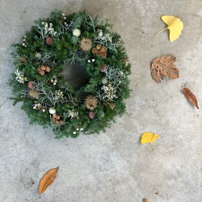 おまかせリースになります。千日紅のブラウンがおすすめポイント。染めなのですが絶妙な色なんです。白だけでなくブラウンとの組み合わせてナチュラルシックなリースに仕上げております。