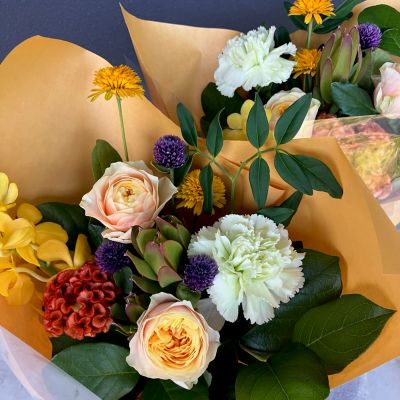 ちょうど夏から秋へお花が移り変わるくらいにお作りしたブーケになります。夏のヒメヒマワリやランのモカラ、秋のケイトウや染めの千日紅、季節の変わり目を感じるブーケです。もう今はリンドウにケイトウ、フジバカマや秋の実物など、市場は暖色系寄りに!私も作るお花が自然とあたたかみのある色になってきています。