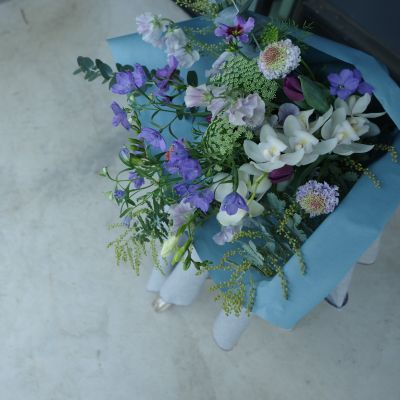 お供えの花束になります。白いシンビジュームにスイトピー、デルフィニュームなどを使い、優しい印象に仕上げております。スイトピーのフリルな感じが入ると、アレンジも花束も柔らかさが増します。最近、私の中のフリフリブーム。その季節ごとに自分の中での小さいブームがあります。そんな直感的な感覚を大切にしたいなぁ、と思います。