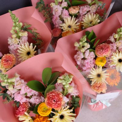 卒園式用の花束になります。元気に明るくとのご依頼でしたので、色合いはミックス、可愛いらしいお花と華やかなラッピングでお作りさせていただきました。今年の3月は気温の上昇があまりなかったので、お花にとってはとても心地よい季節となりました。